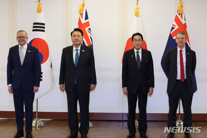 [빌뉴스(리투아니아)=뉴시스] 홍효식 기자 = 북대서양조약기구(NATO·나토) 정상회의에 참석한 윤석열 대통령이 12일(현지시간) 리투아니아 빌뉴스 한 호텔에서 열린 한국·일본·호주·뉴질랜드 4개국(AP4) 정상회동에서 기시다 후미오 일본 총리, 앤서니 앨버니지 호주 총리, 크리스 힙킨스 뉴질랜드 총리와 기념촬영을 하고 있다. 왼쪽부터 앨버니지 호주 총리, 윤 대통령, 기시다 일본 총리, 힙킨스 뉴질랜드 총리. 2023.07.12. [email protected]