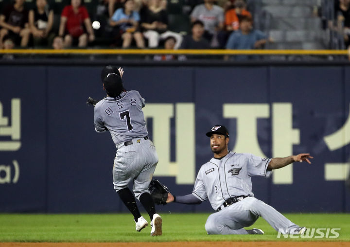 [서울=뉴시스] 고승민 기자 = 12일 서울 잠실야구장에서 열린 2023 KBO 리그 한화 이글스 대 LG 트윈스 경기, 8회말 LG 공격 1사 1,2루 상황 9번타자 신민재 유격수 뒤 1루타를 한화 유격수 이도윤과 좌익수 윌리엄스가 놓치고 있다. 2023.07.12. [email protected]