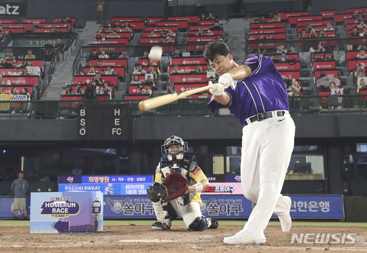 [부산=뉴시스] 김근수 기자 = 14일 오후 부산 동래구 사직야구장에서 열린 2023 KBO 올스타 홈런레이스에서 한화이글스 노시환이 홈런을 치고 있다. 2023.07.14. [email protected]