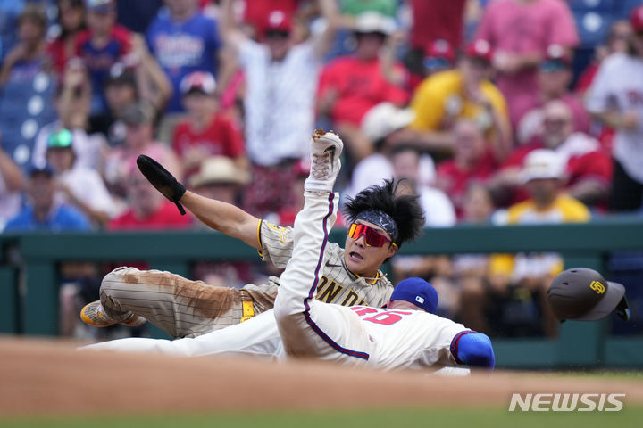 [필라델피아=AP/뉴시스] 샌디에이고 파드리스의 김하성이 15일(현지시각) 미 펜실베이니아주 필라델피아의 시티즌스 뱅크 파크에서 열린 2023 메이저리그 필라델피아 필리스와의 연속 경기 1차전 1회 초 안타 진루 후 페르난도 타티스 주니어의 뜬공에 1루에서 주루사하고 있다. 김하성은 5타수 3안타를 기록했고 팀은 4-6으로 패했다. 2023.07.16.