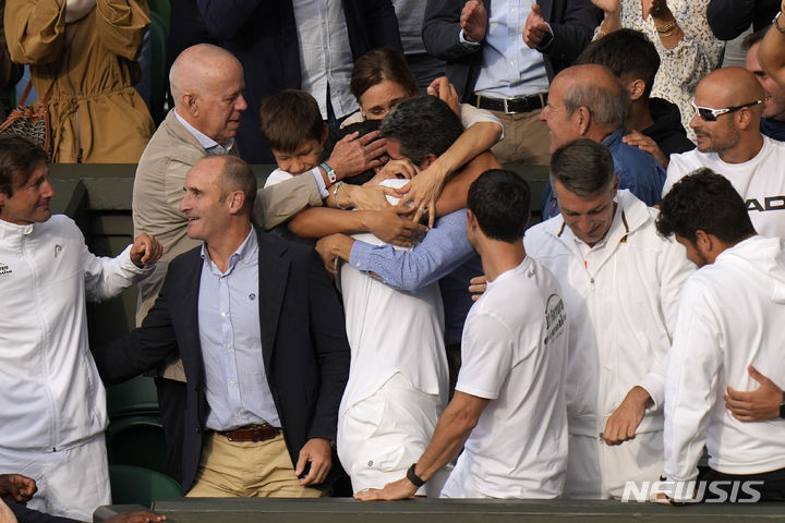 [런던=AP/뉴시스] 카를로스 알카라스(1위·스페인)가 16일(현지시각) 영국 런던에서 열린 2023 윔블던 테니스 대회 남자 단식 결승전 노바크 조코비치(2위·세르비아)를 물리친 후 가족과 포옹하고 있다. 알카라스는 5연패를 노리는 조코비치를 4시간 42분의 풀세트 접전 끝에 3-2(1-6 7-6<8-6> 6-1 3-6 6-4)로 꺾고 윔블던 첫 정상에 올랐다. 2023.07.17.