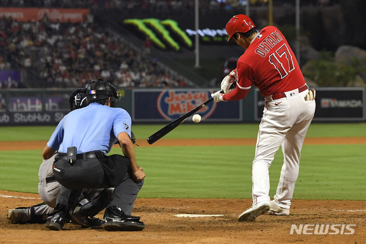 [애너하임=AP/뉴시스] 로스앤젤레스 에인절스의 오타니 쇼헤이가 17일(현지시각) 미 캘리포니아주 애너하임의 에인절 스타디움에서 열린 2023 메이저리그 뉴욕 양키스와의 경기 7회 말 동점 2점 홈런을 치고 있다. 오타니는 4타수 3안타 1홈런(시즌 35호) 2타점 1득점으로 활약했고 팀은 10회 연장 끝 4-3으로 승리했다. 2023.07.18.