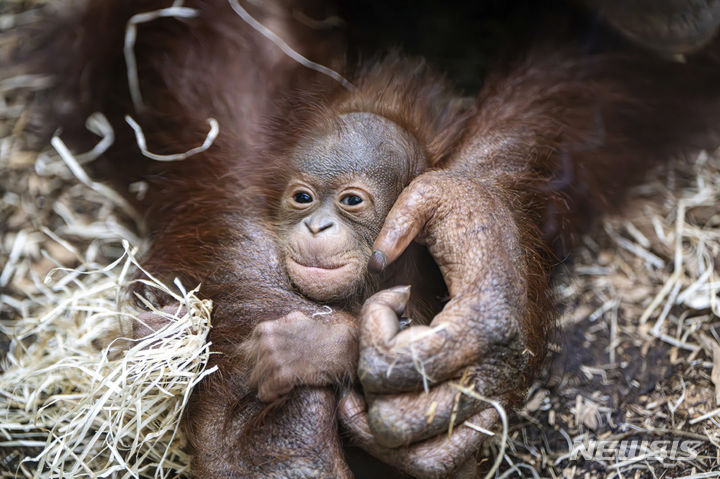[블랙풀=AP/뉴시스] 22일(현지시각) 영국 블랙풀의 블랙풀 동물원에서 올해 13세 된 오랑우탄 '징가'가 생후 5주 된 새끼를 보살피고 있다. 이 새끼 오랑우탄은 동물원 측의 종족 보존 노력 20년 만에 처음으로 태어난 보르네오 오랑우탄으로 수컷이며 아직 이름이 정해지지 않았다. 2023.07.23.