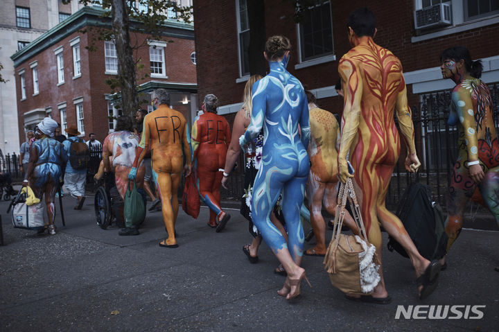 [뉴욕=AP/뉴시스] 23일(현지시각) 미국 뉴욕에서 연례 '보디페인팅 데이' 행사를 마친 모델들이 온몸에 페인팅을 한 채 행사장을 떠나고 있다. 이 행사 주최자인 앤디 골럽은 "10년 이상 지속했던 이 행사도 올해로 마지막"이라며 내년 봄에 새로운 행사로 돌아올 것임을 밝혔다. 2023.07.24.