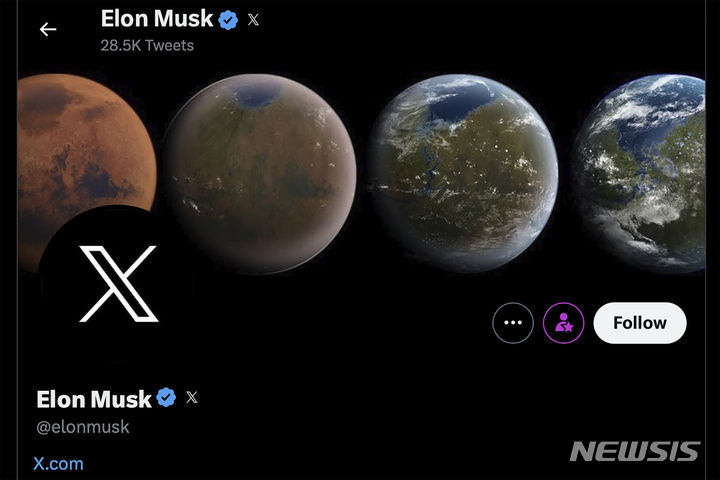 [뉴욕=AP/뉴시스] 24일(현지시각) 미국 뉴욕에서 열어본 일론 머스크의 트위터 계정에 새로운 트위터 로고 'X'가 보인다. 지난해 트위터를 인수한 일론 머스크는 23일 트위터의 로고 '파랑새'를 새로운 로고 'X'로 바꾸겠다고 발표했다. 머스크는 전날 트위터에 "트위터 브랜드인 '새'와 작별하게 될 것"이라고 밝힌 바 있다. 2023.07.25.