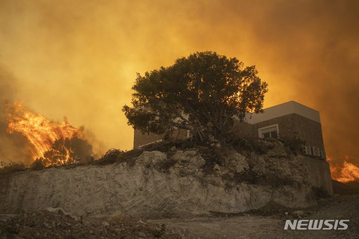 [예나디=AP/뉴시스] 25일(현지시각) 그리스 남동부 로도스섬 예나디 마을 주택가에서 산불이 타오르고 있다. 에비아섬에서는 산불 진화에 나섰던 소방 항공기 1대가 추락해 조종사 2명이 숨졌으며 산불 현장에서 시신 1구도 발견됐다. 2023.07.26.