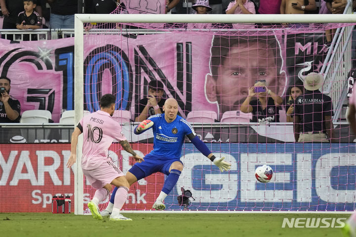 [포트로더데일=AP/뉴시스] 인터 마이애미의 리오넬 메시가 25일(현지시각) 미 플로리다주 포트로더데일의 DRV PNK 스타디움에서 열린 미국 메이저리그사커(MLS) 리그컵 애틀랜타 유나이티드와의 경기에 선발 출전해 득점하고 있다. 메시는 전반 2골과 후반 1도움을 기록하며 팀의 4-0 승리를 이끌었다. 2023.07.26.