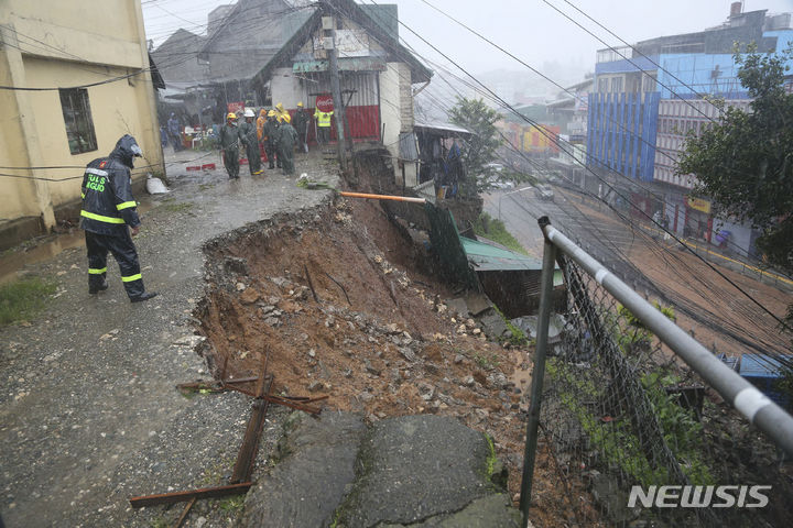 [바기오=AP/뉴시스] 26일(현지시각) 필리핀 북부 바기오의 주택가에서 한 경찰관이 태풍 독수리로 인해 무너진 도로를 조사하고 있다. 필리핀 북부를 강타한 제5호 태풍 독수리의 여파로 저지대 마을에서 홍수가 발생하고 정전 등이 빚어졌으며 1만2천여 명의 이재민이 발생했다. 2023.07.26.