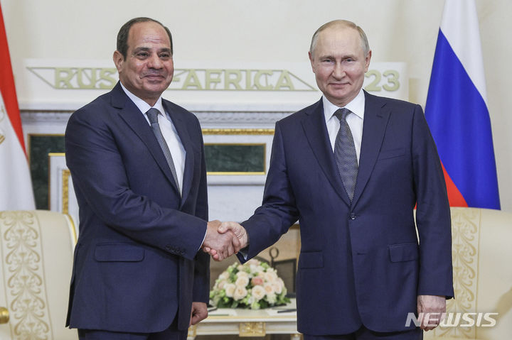 [상트페테르부르크=AP/뉴시스] 블라디미르 푸틴(오른쪽) 러시아 대통령과 압델 파타 엘시시 이집트 대통령이 26일(현지시각) 러시아 상트페테르부르크에서 열린 러시아-아프리카 정상회담에 참석해 별도 회담에 앞서 악수하고 있다. 2023.07.27.