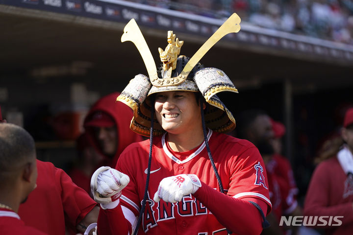 [디트로이트=AP/뉴시스] 로스앤젤레스 에인절스의 오타니 쇼헤이가 27일(현지시각) 미 미시간주 디트로이트의 코메리카파크에서 열린 2023 메이저리그 디트로이트 타이거스와의 연속 경기 2차전 4회 초 1점 홈런을 친 후 쇼군 모자를 쓰고 세리머니하고 있다. 오타니는 2회엔 2점 홈런을 치며 시즌 37·38호를 기록했다. 2023.07.28.