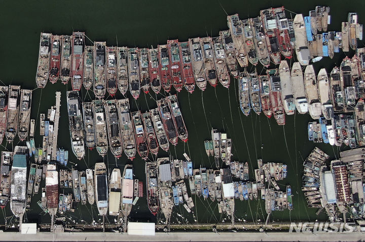 [차오저우=AP/뉴시스] 제5호 태풍 독수리가 중국 광둥성 차오저우에 접근하면서 27일(현지시각) 어선들이 항구에 대피해 정박해 있다. 필리핀에 산사태 등의 피해를 발생시킨 태풍 독수리가 중국에 상륙할 것으로 예상된다. 2023.07.28.