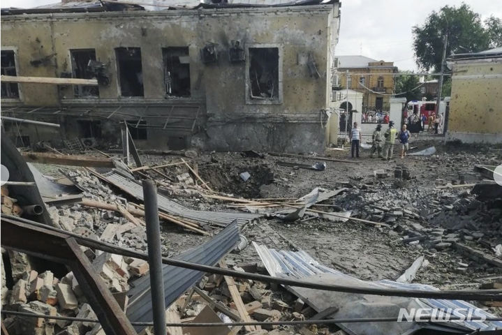 [타간로그=AP/뉴시스] 28일(현지시간) 러시아 서남부 항구도시 타간로그의 폭발 현장. 러시아 국방부는 이날 우크라이나 국경에서 약 40㎞ 떨어진 남부 도시 타간로그에서 우크라이나 미사일을 격추했다며 요격 과정에서 떨어진 파편으로 여러 명이 부상하고 건물 등이 파손됐다고 밝혔다. 2023.07.29.