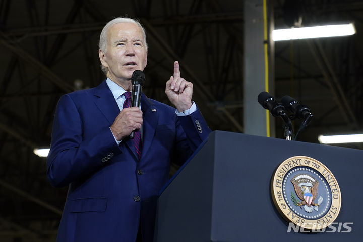 [오번(메인 주)=AP/뉴시스] 조 바이든 미국 대통령이 28일(현지시간) 메인주 오번의 제조업체에서 연설하고 있다. 바이든 대통령은 이날 회사들이 미국에서 새로운 발명품을 생산하도록 장려하기 위한 행정명령에 서명했다. 2023.07.29.