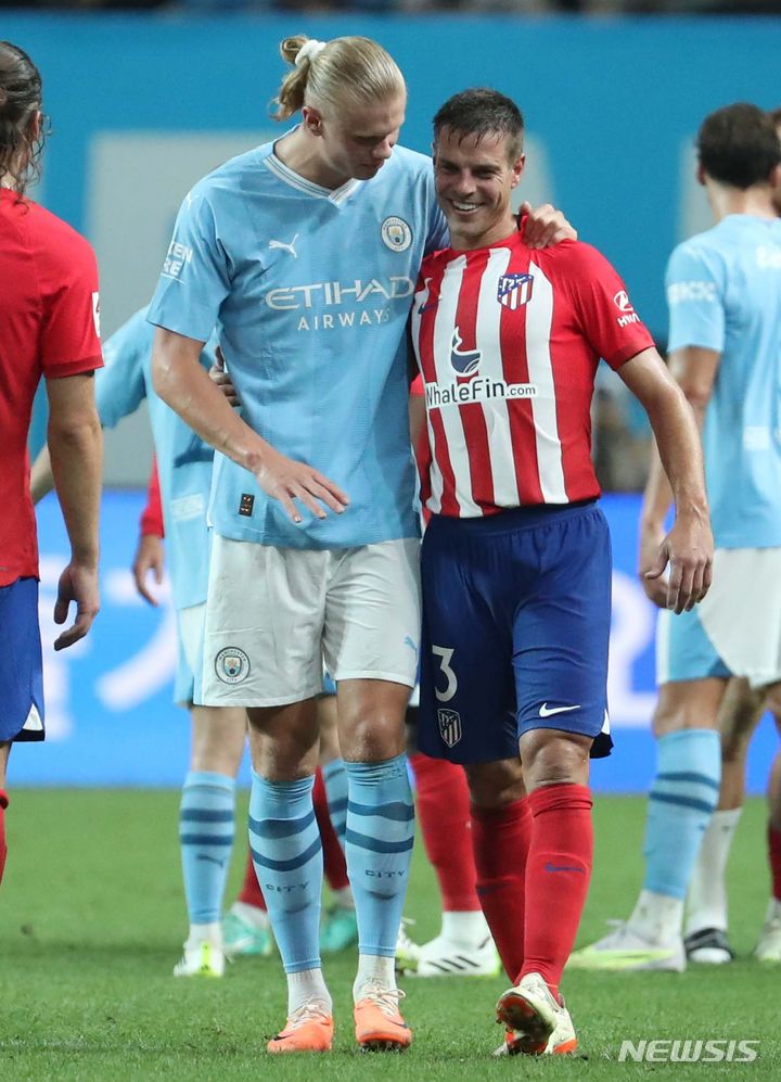 [서울=뉴시스] 황준선 기자 = 30일 서울 마포구 서울월드컵경기장에서 열린 쿠팡플레이시리즈 2차전 맨체스터 시티와 아틀레티코 마드리드의 경기, 멘체스터 시티의 엘린 홀랑과 아틀레티코 마드리드의 아스필리쿠에타가 대화를 나누고 있다. 2023.07.30. [email protected]
