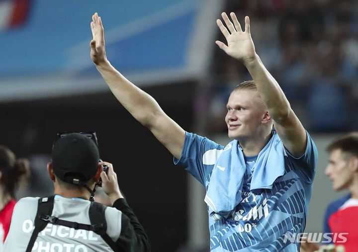 [서울=뉴시스] 김근수 기자 = 30일 서울 마포구 서울월드컵경기장에서 열린 쿠팡플레이시리즈 2차전 맨체스터 시티와 아틀레티코 마드리드의 경기, 2대 1로 아틀레티코 마드리드의 승리, 홀란드가 관중들에게 인사하고 있다. 2023.07.30. [email protected]