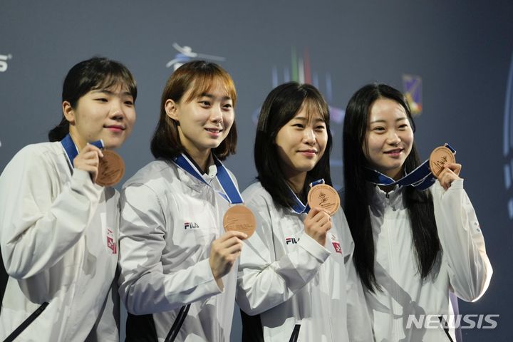 [밀라노=AP/뉴시스] 한국 여자 펜싱 사브르 선수들이 30일(현지시각) 이탈리아 밀라노에서 열린 2023 국제펜싱연맹(FIE) 세계선수권대회 여자 단체 사브르에서 동메달을 목에 걸고 시상대에 올라 기념 촬영을 하고 있다. 2023.07.31.