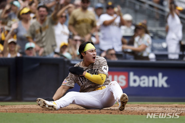 [샌디에이고=AP/뉴시스] 샌디에이고 파드리스의 김하성이 30일(현지시각) 미 캘리포니아주 샌디에이고의 펫코 파크에서 열린 2023 메이저리그 텍사스 레인저스와의 경기 3회 초 3루에서 잰더 보가츠의 희생 플라이 때 슬라이딩 득점하면서 어깨를 다쳐 괴로워하고 있다. 김하성은 1타수 1안타 1볼넷 1득점 1도루(21호)로 활약 중 부상으로 교체됐다. 2023.07.31.