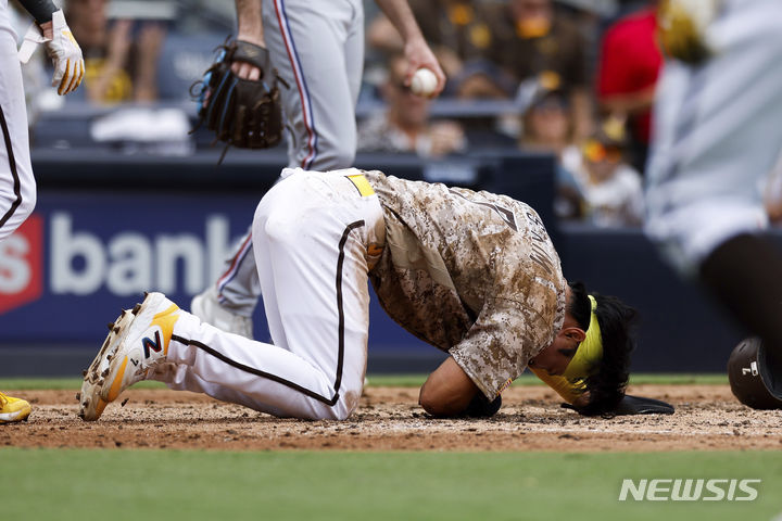 [샌디에이고=AP/뉴시스] 샌디에이고 파드리스의 김하성이 30일(현지시각) 미 캘리포니아주 샌디에이고의 펫코 파크에서 열린 2023 메이저리그 텍사스 레인저스와의 경기 3회 초 3루에서 잰더 보가츠의 희생 플라이 때 슬라이딩 득점하면서 어깨를 다쳐 괴로워하고 있다. 김하성은 1타수 1안타 1볼넷 1득점 1도루(21호)로 활약 중 부상으로 교체됐다. 2023.07.31.