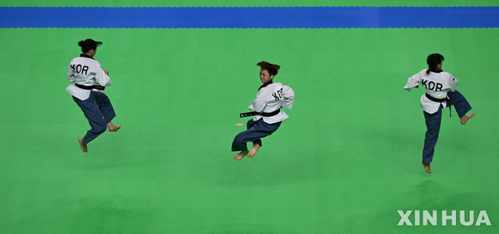 [청두=신화/뉴시스] 한국 여자 태권도 선수들이 30일(현지시각) 중국 쓰촨성 청두에서 열린 제31회 청두하계세계대학경기대회(유니버시아드) 태권도 품새 단체 결승전에서 경기하고 있다. 한국은 남녀 품새 단체전에서 각각 금메달을, 혼성 품새에서는 중국에 금메달을 내주며 은메달을 목에 걸었다. 2023.07.31.