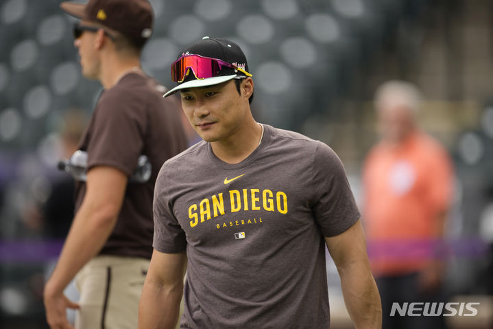 [덴버=AP/뉴시스] 샌디에이고 파드리스의 김하성이 지난달 31일(현지시각) 미 콜로라도주 덴버의 쿠어스필드에서 열리는 2023 메이저리그 콜로라도 로키스와의 경기를 앞두고 몸을 풀고 있다. 전날 어깨를 다쳤던 김하성은 지명타자로 출전할 것으로 알려졌다. 2023.08.01.