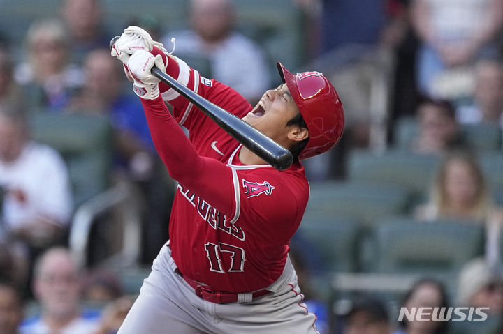 [애틀랜타=AP/뉴시스] 로스앤젤레스 에인절스의 오타니 쇼헤이가 지난달 31일(현지시각) 미 조지아주 애틀랜타의 트루이스트 파크에서 열린 2023 메이저리그 애틀랜타 브레이브스와의 경기 1회 초 몸에 공을 맞으며 아파하고 있다. 오타니는 3타수 2안타 2사사구를 기록했고 팀은 4-1로 승리했다. 2023.08.01.