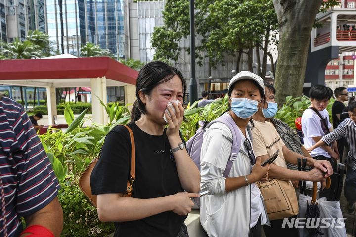 [홍콩=AP/뉴시스] 1일(현지시각) 홍콩에서 가수 코코리의 비공개 장례식이 열려 장례식장 밖에 모인 팬들이 눈물을 흘리고 있다. 중화권 최고 인기 가수 코코리는 영화 '와호장룡'의 주제가, 중국어 버전 '뮬란'에서 뮬란의 목소리 연기와 주제가 등을 불렀다. 리는 지난달 2일 우울증으로 자택에서 극단적 선택을 시도, 병원으로 이송됐다가 5일 끝내 세상을 떠났다. 2023.08.01.
