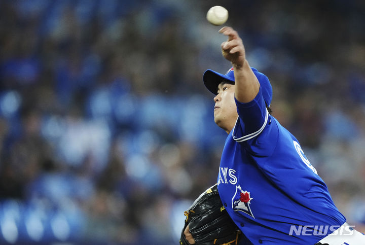 [토론토=AP/뉴시스] 토론토 블루제이스의 류현진이 1일(현지시각) 캐나다 토론토의 로저스센터에서 열린 2023 메이저리그 볼티모어 오리올스와의 경기 1회 초 투구하고 있다. 14개월 만에 복귀한 류현진은 1회에만 3피안타 2실점 하며 불안한 출발을 보였다. 2023.08.02.