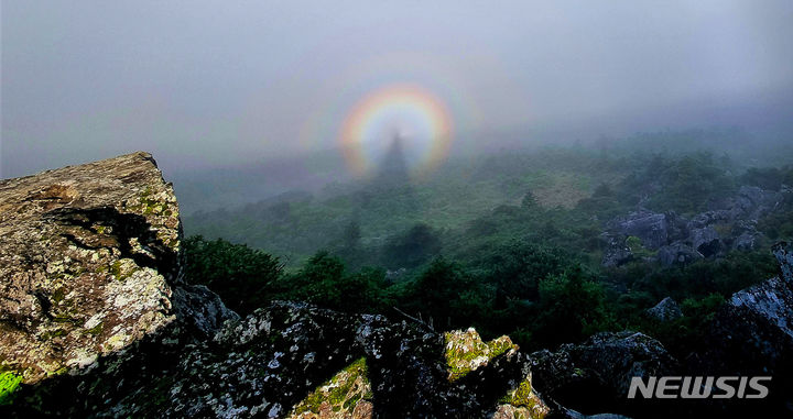 [제주=뉴시스] 우장호 기자 = 3일 오전 한라산 백록담 정상 부근에서 고리형 무지개에 사람 그림자가 보이는 브로켄(Brocken) 현상이 나타나 시선을 끌고 있다. 브로켄은 태양을 등지고 섰을 때 사람이나 사물의 그림자 주변에 무지개 띠 같은 형상이 나타나는 대기광학 현상이다. 독일의 브로켄 산에서 처음 발견돼 이름이 붙여졌다. 과거에는 요괴나 귀신으로 착각했으나 최근에는 행운의 상징으로 여긴다. (사진=김경미씨 제공) 2023.08.03. [email protected]