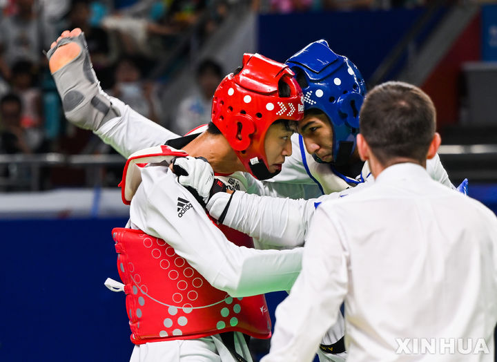 [청두=신화/뉴시스] 이경학(왼쪽)이 4일(현지시각) 중국 쓰촨성 청두에서 열린 제31회 청두하계세계대학경기대회(유니버시아드) 태권도 남자 단체전 결승전에서 아리안 살리미(이란)와 경기하고 있다. 한국은 단체전에 서건우, 이상열, 유진, 이경학이 출전해 금메달을 목에 걸었다. 2023.08.05.