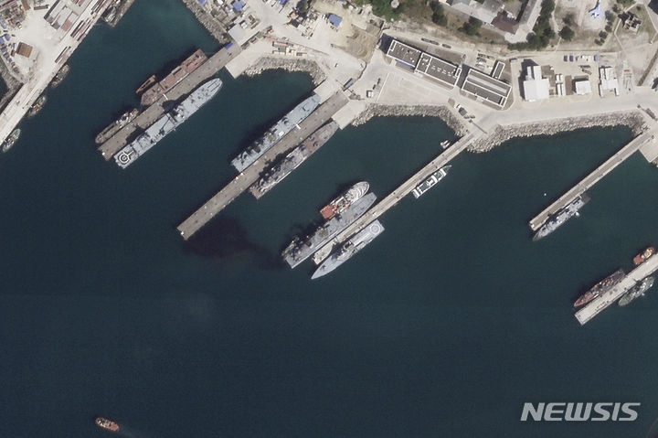[노보로시스크=AP/뉴시스] 플래닛 랩스가 제공한 위성 사진에 4일(현지시각) 러시아 노보로시스크에 정박 중인 러시아 상륙함 올레네고르스키 고르냐크에서 기름이 새 나오고 있다. 우크라이나는 흑해가 전쟁에서 점점 더 중요한 격전지가 되면서 그들의 해상 드론이 러시아 주요 항구를 강타해 군함을 손상했다고 전했다. 2023.08.05.