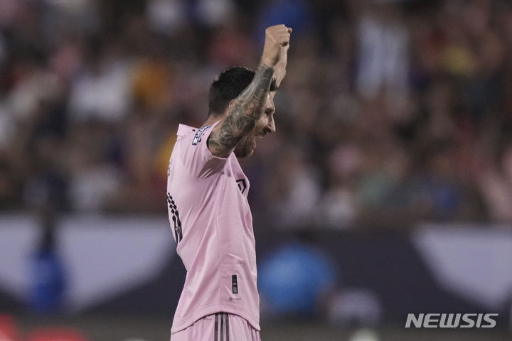 [프리스코=AP/뉴시스] 인터 마이애미의 리오넬 메시가 6일(현지시각) 미 텍사스주 프리스코의 도요타 스타디움에서 열린 미국프로축구 메이저리그사커(MLS) 리기스컵 16강전 FC 댈러스와의 경기 전반 6분 선제골을 넣고 환호하고 있다. 메시는 MLS 이적 후 4경기 6골 1도움을 기록하고 있다. 2023.08.07.