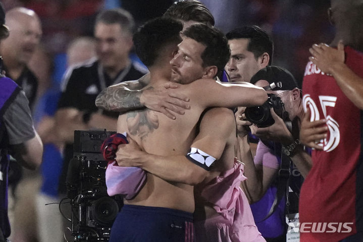[프리스코=AP/뉴시스] 인터 마이애미의 리오넬 메시(오른쪽)가 6일(현지시각) 미 텍사스주 프리스코의 도요타 스타디움에서 열린 미국프로축구 메이저리그사커(MLS) 리기스컵 16강전에서 FC 댈러스의 알란 벨라스코와 유니폼을 교환한 후 포옹하고 있다.  메시는 전반 6분과 후반 40분에 각각 선제골과 동점 골을 넣었으며 마이애미는 이어진 승부차기에서 5-3으로 승리하며 8강에 진출했다. 2023.08.07.