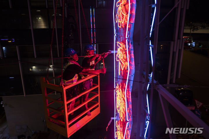 [홍콩=AP/뉴시스] 6일(현지시각) 홍콩에서 인부들이 1964년부터 걸려있던 유명 식당 '타이핑쿤'의 네온사인 간판을 철거하고 있다. 홍콩 야경의 상징이었던 네온사인 간판이 홍콩 정부의 간판 안전 규제 강화로 사라지고 있다. 2023.08.07.
