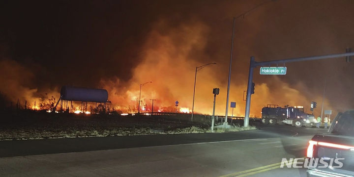 [라하이나=AP/뉴시스] 하와이 마우이섬 공보실이 제공한 사진에 8일(현지시각) 마우이섬 호키오키오 플레이스와 라하이나 사이 도로에서 불길이 치솟고 있다. 현지 관계자는 허리케인 '도라'로 인한 강풍으로 산불이 확산하면서 지금까지 최소 6명이 숨졌으며 주 비상사태가 선포됐다고 밝혔다. 2023.08.10.