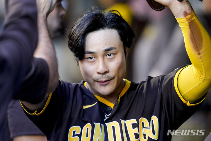 [시애틀=AP/뉴시스] 샌디에이고 파드리스의 김하성이 9일(현지시각) 미 워싱턴주 시애틀의 T모바일 파크에서 열린 2023 메이저리그 시애틀 매리너스와의 경기 1회 초 선취 득점 후 더그 아웃에서 환영받고 있다. 김하성은 볼넷으로 진루해 2,3루 연속 도루에 성공한 후 후안 소토의 투수 앞 땅볼 때 득점했다. 2023.08.10.