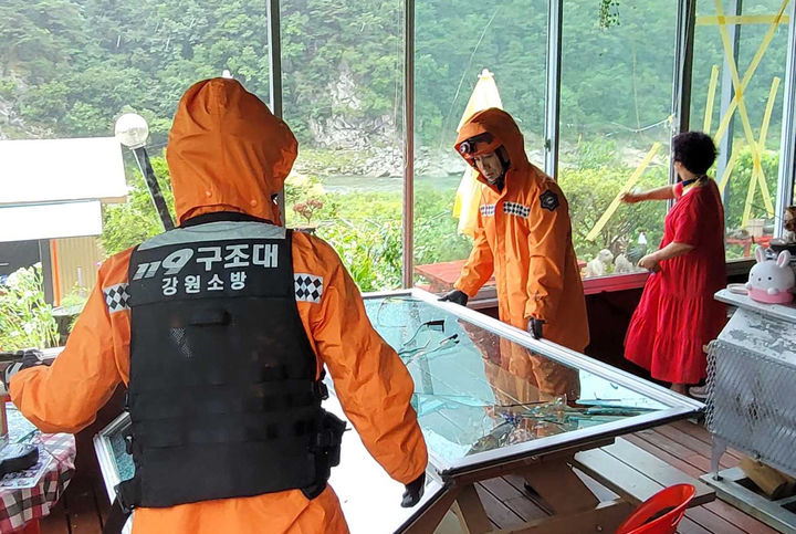 [서울=뉴시스] 소방대원들이 10일 강원 인제군 인제읍에서 태풍 카눈 영향으로 창문이 파손돼 안전조치를 하고 있다. (사진=소방청 제공) 2023.08.10. [email protected] *재판매 및 DB 금지