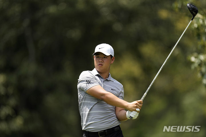 [멤피스=AP/뉴시스] 김주형이 11일(현지시각) 미 테네시주 멤피스의 TPC 사우스윈드에서 열린 미국프로골프(PGA) 투어 플레이오프(PO) 1차전 페덱스 세인트주드 챔피언십 2라운드 7번 홀에서 티샷하고 있다. 첫날 단독 2위였던 김주형은 중간 합계 8언더파 132타 공동 3위를 기록했다. 2023.08.12.
