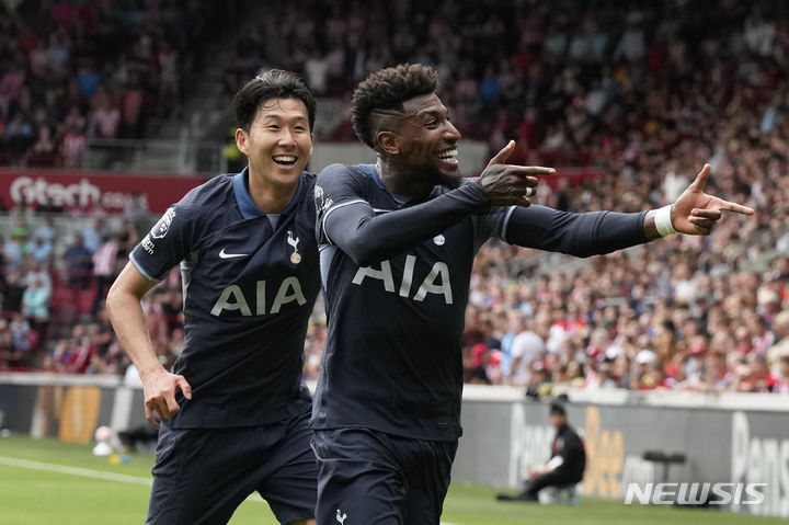 [브렌트퍼드=AP/뉴시스] 토트넘 홋스퍼의 손흥민(왼쪽)이 13일(현지시각) 영국 브렌트퍼드의 지테크 커뮤니티 스타디움에서 열린 2023-24시즌 잉글랜드 프로축구 프리미어리그(EPL) 브렌트퍼드와의 개막전 전반 추가시간 에메르송 로얄의 동점골을 축하하고 있다. 주장 데뷔전을 치른 손흥민은 전반 26분경 PK를 헌납해 실점의 빌미를 제공했고 토트넘은 2-2로 비겼다. 2023.08.14.