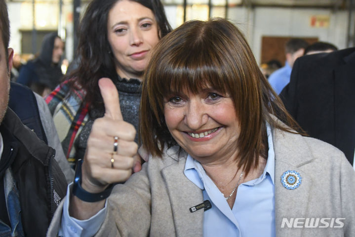 [부에노스아이레스=AP/뉴시스] 파트리샤 불리치 아르헨티나 예비 선거 후보가 13일(현지시각) 아르헨티나 부에노스아이레스에서 예비 선거 투표를 마치고 엄지를 보이고 있다. 아르헨티나 예비 선거는 만 18세 이상 국민의 의무 선거이며 10월 22일 총선 결과를 가늠할 수 있는 중요한 척도다. 2023.08.14.