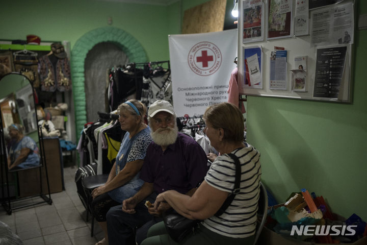 [쿠피안스크=AP/뉴시스] 14일(현지시각) 우크라이나 쿠피안스크 안전 가옥에 대피한 주민들이 모여 얘기를 나누고 있다. 우크라이나 적십자 대원들은 최근 러시아가 공격을 강화하고 있는 북동부 전선 인근 주민들의 대피를 돕고 있다. 2023.08.15.