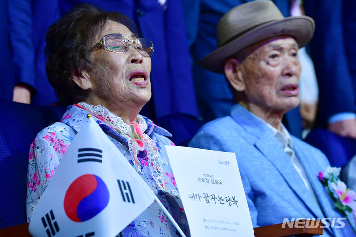 [광주=뉴시스] 이영주 기자 = 일제강제노역 피해자 양금덕 할머니와 이경석 할아버지가 15일 오전 광주시청에서 열린 제78주년 광복절 경축식에 참여해 애국가를 부르고 있다. 2023.08.15. [email protected]