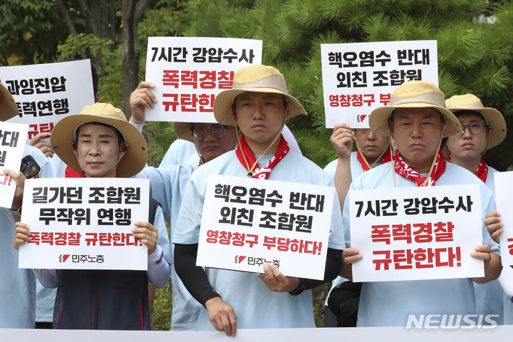 [서울=뉴시스] 김근수 기자 = 전국민주노동조합총연맹 조합원들이 15일 오후 서울 송파구 동부지방법원 앞에서 경찰의 과잉 진압·폭력연행·강압수사를 규탄하는 피켓시위를 하고 있다. 지난 12일 민주노총 중앙통일선봉대 조합원 일부가 서울 광화문광장 세종대왕 동상 앞에서 미신고 집회를 하다 경찰관과 몸싸움을 벌이던 중 전국민주노동조합총연맹(민주노총) 조합원 2명에 대해 경찰이 구속영장을 신청했다. 이날 오후 서울 송파구 동부지방법원에서 민주노총 조합원 2명에 대해 피의자 전 구속 심사(영장실질심사)가 열린다. 2023.08.15. [email protected]
