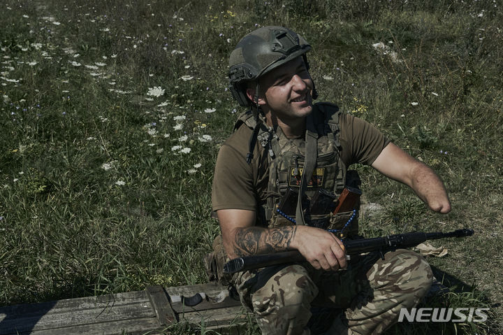 [바흐무트=AP/뉴시스] 1년 전 러시아군과의 전투 중 왼손을 잃은 우크라이나 군인(암호명 아라)이 15일(현지시각) 우크라이나 도네츠크주 바흐무트 인근 전선에서 자동소총을 들고 웃고 있다. 2023.08.16.