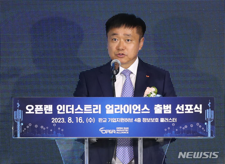 [성남=뉴시스] 조수정 기자 = ORIA 당해년도 대표의장사 SKT 강종렬 사장이 16일 오후 경기 성남시 판교 기업지원허브에서 열린 오픈랜 인더스트리 얼라이언스 출범 선포식에서 축사하고 있다. 2023.08.16. [email protected]