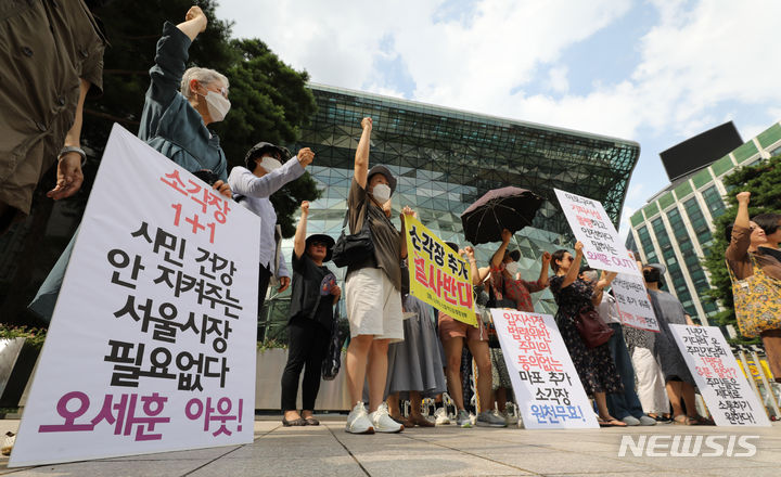 [서울=뉴시스] 황준선 기자 = 마포소각장 추가 백지화 투쟁본부 등 마포구 주민으로 구성된 5개 단체원들이 17일 오후 서울 중구 서울시청 앞에서 오세훈 서울시장과의 면담을 앞두고 마포구 신규 소각장 설립에 반대하는 기자회견을 하고 있다. 2023.08.17. [email protected]
