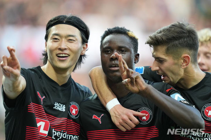 [헤르닝=AP/뉴시스] 미트윌란의 조규성(왼쪽)이 17일(현지시각) 덴마크 헤르닝의 MCH 아레나에서 열린 2023-24시즌 유럽축구연맹(UEFA) 유로파 콘퍼런스리그(UECL) 3차 예선 2차전 오모니아 니코시아(키프로스)와의 경기 중 프란쿨리누의 득점을 축하하고 있다. 미트윌란은 5-1로 승리해 1,2차전 합계 5-2를 기록하며 플레이오프에 진출했다. 2023.08.18.