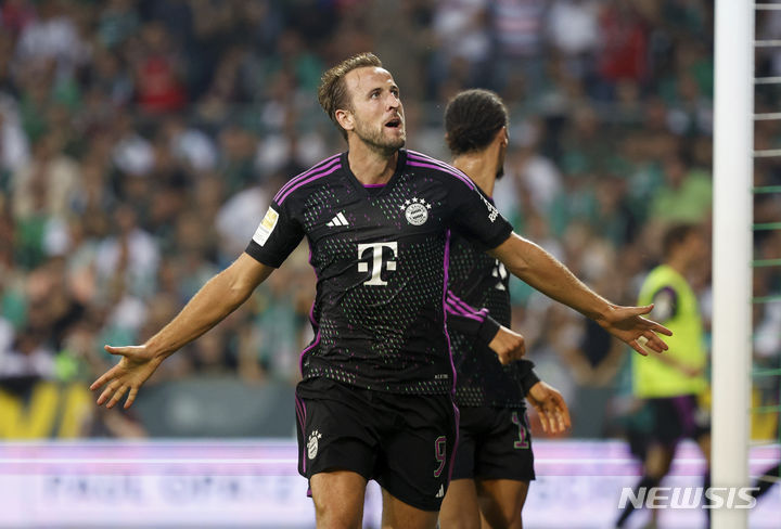 [브레멘=AP/뉴시스] 바이에른 뮌헨의 해리 케인이 18일(현지시각) 독일 브레멘의 베저스타디온에서 열린 2023-24 분데스리가 베르더 브레멘과의 개막전 후반 29분 팀의 두 번째 골을 넣고 기뻐하고 있다. 케인은 분데스리가 데뷔전에서 1골 1도움을 기록하며 팀의 4-0 완승을 이끌었다. 2023.08.19.