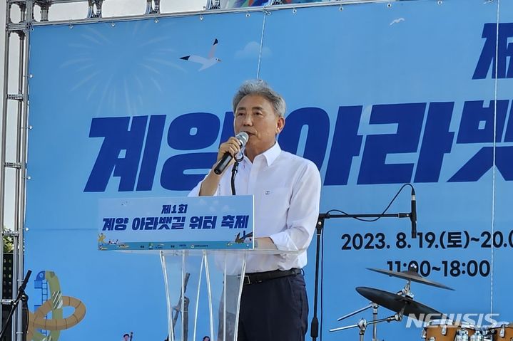 [인천=뉴시스] 이루비 기자 = 윤환 인천 계양구청장이 19일 오후 인천 계양구 장기동 황어광장 일원에서 열린 '제1회 계양 아라뱃길 워터축제'에서 개회사를 하고 있다. 윤 구청장은 "물길만 내주던 아라뱃길이 계양의 랜드마크로 발돋움하고 있다"면서 "경관조명사업을 통해 다음달엔 라이트쇼도 개최할 예정"이라고 말했다. 2023.08.19. [email protected]