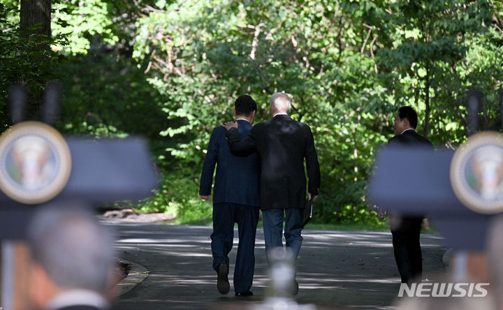 [캠프 데이비드=뉴시스] 전신 기자 = 윤석열 대통령이 18일(현지시간) 메릴랜드주에 위치한 미국 대통령 별장 캠프 데이비드에서 열린 한미일 공동기자회견을 마친 뒤 조 바이든 미국 대통령, 기시다 후미오 일본 총리와 이동하고 있다. (공동취재) 2023.08.19. [email protected]