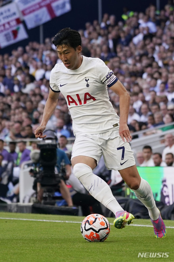 [런던=AP/뉴시스] 토트넘 홋스퍼의 손흥민이 19일(현지시각) 영국 런던의 토트넘 홋스퍼 스타디움에서 열린 맨체스터 유나이티드와 2023-24 잉글랜드 프로축구 프리미어리그(EPL) 2라운드에 선발 출전해 공을 몰고 있다. 주장 손흥민은 이타적인 플레이를 펼치며 풀타임을 소화했고 토트넘은 2-0으로 승리했다. 2023.08.20.